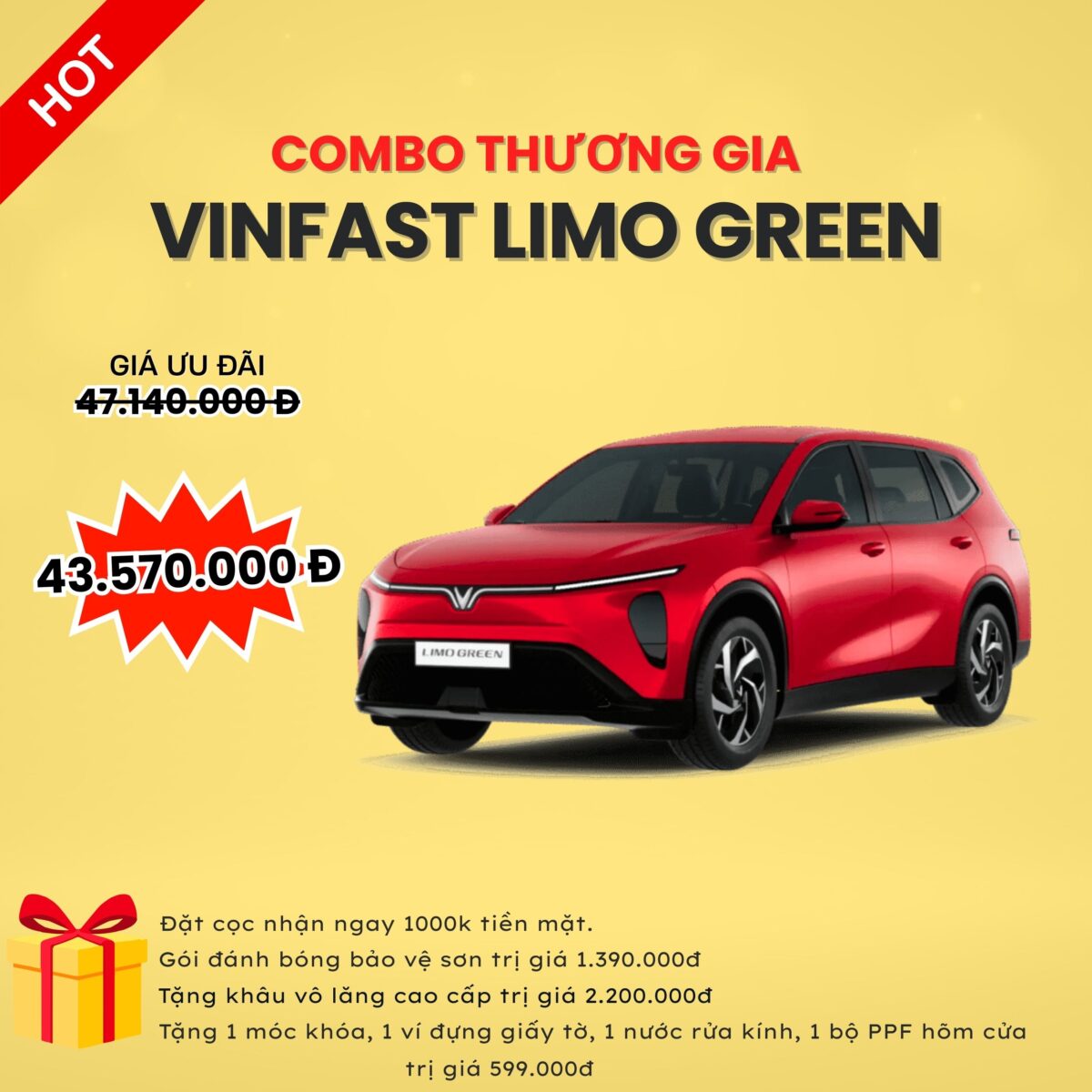 Khi lựa chọn Độ xe VinFast Limo Green Combo Thương gia tại Auto365 Thanh Hóa, Giá combo 47.140.000đ, ( Giá gốc: 43.570.000đ ) tiết kiệm hơn 4.570.000đ khách hàng sẽ nhận ngay quà tặng trị giá 2.739.000 đ, bao gồm: